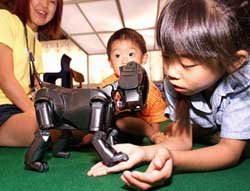日本一少女在28日新奇地看著由索尼公司開發的機器小狗‘AIBO’. 索尼公司在東京召開的高科技博覽會上﹐展示了機器小狗.