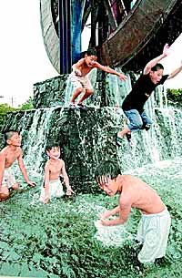 8日﹐在漢城市東大門區長安洞水碓蓮花池裡玩耍的調皮鬼們天真爛漫的樣子﹐使看著的人心裡舒暢. 東大門區廳以蓮花池為區的境界標誌.