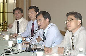 民主黨少壯派議員于10日接待了日本的少壯派議員﹐在漢城市某一賓館以‘展望政治改革及韓日關係’為主題﹐召開討論會﹐正討論年青政治人的作用. 兩國各派5名議員出席了此次討論會.