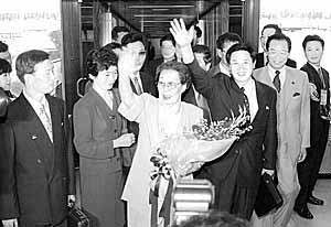 北側離散家屬重逢團團長柳美英(天道教青友黨中央委員長CHAIRWOMAN ﹐NORTH KOREA CHONDOIST CHUNGWOO CHURCH前任外務部長崔德信的夫人)在金浦機場貴賓室說﹕‘離開漢城已有23年了﹐如今重返故地感慨萬千.一直為團結與統一而努力’