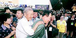 星期五上午北側訪問團離開華克山莊之前﹐北側的姜永源在賓館門廊裡背著老母﹐撫平離別的苦痛.