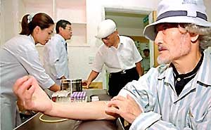 9月2日即將回朝鮮的非轉向長期囚犯張浩(右邊)24日在漢城紅十字醫院正接受體檢﹐為的是拿到護照.