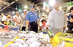 因含鉛中國產海螃蟹事件影響波及全國﹐27日漢城市農水產品公司職員們在漢城加樂洞水產市場上利用金屬探測器對海螃蟹裡有沒有鉛塊進行檢查.