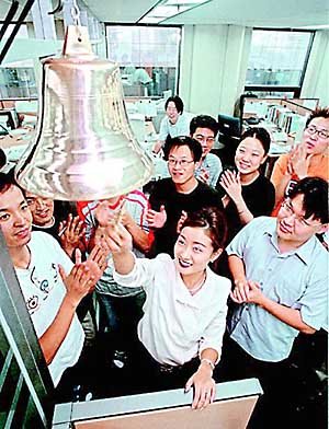 一公司的職員們聚集在金鐘週圍敲鐘為本公司慶祝.