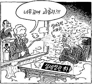 在向實權派長官朴某的週圍某蒼蠅們噴殺虫劑的李會昌: "太不順心, 難受吧?"