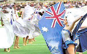 在27屆悉尼奧運會開幕前夕﹐于13日舉行的女足開幕表演中身著用澳大利亞國旗做的服裝的女演員們﹐正在展示優美舞姿.