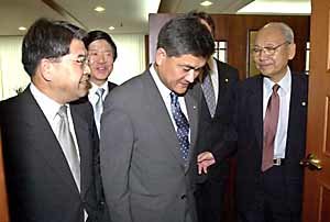 民主黨李在禎(左側),政範九(中間)議員16日向徐英勛(右側)代表就前一天初次當選和再次當選的議員聚會風波一事道歉後出現在代表室裡