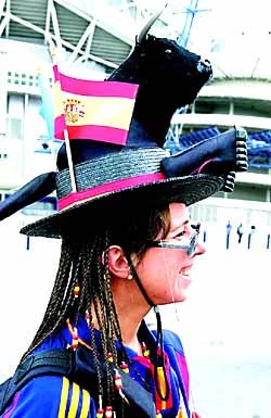 "奧運會上醒目的國旗裝"﹐以參加悉尼奧運會的各國國旗為圖案的啦啦隊的國旗裝﹐非常豐富多樣.從左邊起﹐在賽馬場胸膛上刻上國旗的克羅地亞女性和臉上畫着本國國旗的女性﹐觀看沙灘排球的喜悅異常的克林頓總統的女兒切爾西﹐頭上戴着以本國國旗為素材的各種裝飾品或插上國旗的人們也倍受注目.其中﹐韓國啦啦隊也把太極旗和韓半島旗插在頭上﹐興高彩烈.