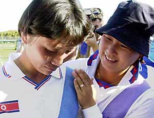 在19日舉行的女子射箭3﹑4名的決賽中﹐獲得銅牌的金水寧(右邊)正在安慰比賽失敗後哭泣的北韓選手崔玉實.