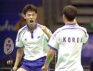 男子羽毛球雙打半決賽中﹐韓國的李東秀(左)扣球成功後﹐看着自己的搭擋柳鏞成﹐握拳示意﹐其勢氣非常高漲.
