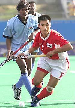 在21日進行的男子曲棍球預賽中﹐韓國隊的金龍培(右邊)甩開印度選手後﹐正在尋找傳球的地方.