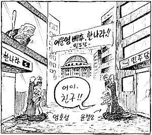 民主黨掛出寫有‘李運永背後是大國家黨’字眼的橫幅.