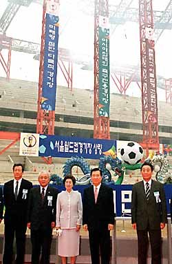 金大中總統(左三)夫婦等主要人士25日上午在世界盃主賽場上樑儀式上﹐觀看44個風箏形的屋頂架中最後一個頂架的連接.