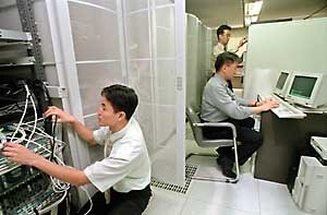 在28日發生電腦系統事故的漢城汝矣島東原證券電腦室裡﹐員工們正通宵達旦地進行修復作業.