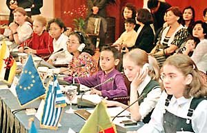 為了 紀念第三次ASEM會議﹐在INTERCONTINENTY賓館舉行了小型ASEM2000會議的26個國家的兒童們手持本國國旗﹐拍照紀念.