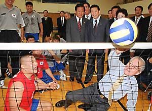大國家黨總裁李會昌8日在激勵訪問漢城政立會館,即將參加悉尼殘奧會的運動員們後﹐正與他們一起打排球.