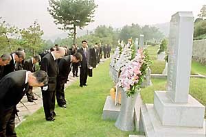 外交通商部部長李延彬和21名外交部局長級以上干部9日(星期天)在漢城銅雀洞國立墓地﹐舉行了阿翁山殉國使節第17週年的悼念活動﹐祈禱.故人安息.