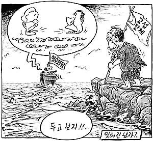 金鐘泌(衣衫襤褸地站着,手持"交涉團體"的旗幟抬頭望着駛去的小船——朝野領導人會談的意思)﹕走着瞧﹗﹗