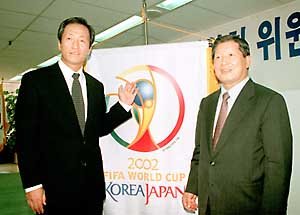 大韓足球協會會長鄭夢准(左)和國民體育振興公團理事長李衍澤10日在世界盃組織委員會共同委員長就任儀式上﹐表示決心將此次世界盃辦成成功的大會.