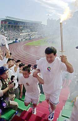 新千年第一次全運會第81屆全國體育運動會﹐周四在釜山九德運動場主賽場舉行開幕式﹐並開始了為期7天的緊張比賽.全國16個市道和12個海外同胞選手團﹑釜山市民等三萬多人參加了開幕式.各市道選手團入場後﹐文化觀光部部長金漢吉宣佈開幕﹐釜山廣域市市長安相英致歡迎詞﹐熱烈歡迎各市道選手團.