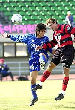 水原三星隊的得分手朴建夏(左邊)正與浦項制鐵隊的後衛薩比奇一同跳起爭頂.