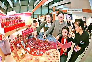 法國產業博覽會于17日在漢城貿易展覽館開幕.參觀者紛紛而至﹐盛況空前.在參加博覽會的一個化妝品公司櫃檯前﹐一位參觀者正在接受服務人員的彩妝服務.