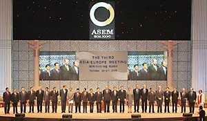 參加第三屆亞歐首腦會議(ASEM)開幕式的26國(包括EU)首腦們20日在漢城的‘COEX會議中心’攝影留念.