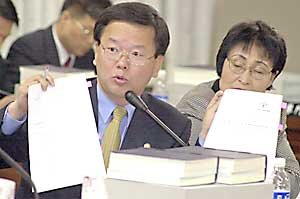 31日上午﹐在果川政府綜合大廈進行的政務委的公正交易委員會國政監查中﹐大國家黨議員金富謙兩手拿資料﹐對疑點進行提問.