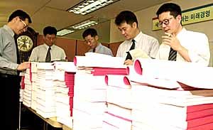 在停業企業名單發表前一天即2日下午﹐銀行職員們神情嚴肅地看各企業送來的有關負債的文件﹐做着選定停業企業的最後工作.