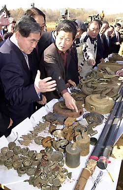 國會建設交通委所屬議員們﹐3日來到京畿道坡州市京義線鐵路及公路連接工地現場監查﹐查看最近軍隊拆去的地雷殘骸.