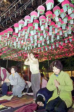 4日凌晨﹐在漢城江北區牛耳洞的道仙寺﹐即將參加大學入學考試的考生家長們正在作徹夜祈禱.