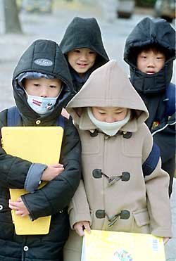8日﹐漢城的溫度下降至攝氏零度.早晨﹐鐘路區某小學的學生們身穿厚厚的冬大衣﹐戴着口罩﹐‘全副武裝’地前往學校.
