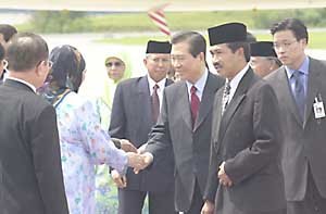 13日,金大中總統到達文萊首都斯裡巴加灣機場,在專程前來迎接的王子穆塔迪‧比拉(右起第二位)的介紹下,與文萊的政要們寒暄.