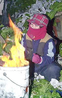 17日的溫度接近于零下.凌晨﹐在漢城的某水果疏菜市場上﹐正在販賣白菜(做泡菜用)的某位商人身着厚厚的衣服.儘管這樣他似乎還是不夠暖和﹐又架起樹枝燒了一個火堆﹐以此來驅寒.