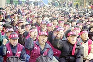 22日﹐在漢城汝矣島舉行的反對公共部門結構調整的集會上﹐勞動者們紛紛反對韓國電力等公共部門的結構調整﹐並高呼口號.