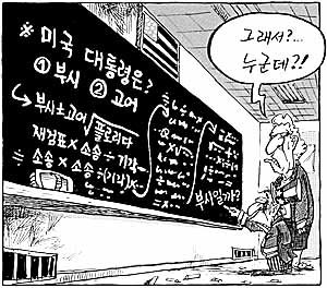 黑板上寫有許多解題的公式,但他只寫了"是布什?"就猶豫不決了.