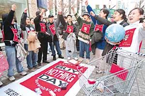 26日是環境團體設立的‘不買東西日(Buy Nothing Day)’.為了保護環境﹐環境團體會員們于當天在漢城明洞決心共同來節制過度消費.