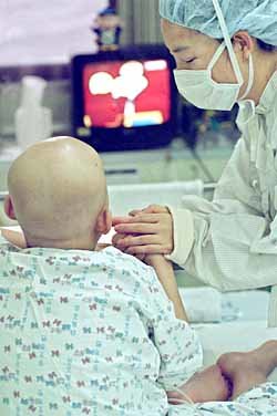 在漢城汝矣島的聖母醫院無菌室中﹐身患白血病的孩子正看着電視.母親緊緊握住他的手在做祈禱.