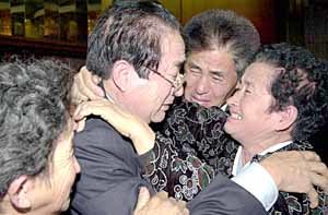 平北寧邊出生的金光文(74歲,音)30日在平壤高麗飯店會晤韓戰1.4撤退時離散的妹妹光林(65歲,音)兩人緊緊抱在一起﹐以眼痕磻茪嬤伬奕{的喜悅.
