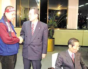 勞動部長官金浩鎮(中)與韓國電力工會委員長吳慶鎬(音譯-左)3日凌晨在中央勞動委員會辦公室裡﹐就撤回罷工和法人分割時事先通知工會等內容達成協議後握手.