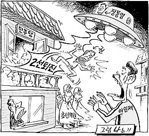 在總統主持的民主黨最高委員會議上, 最高委員鄭東泳(坐在UFO上)強烈主張權魯甲委員應該退出政壇. 中間排列坐着首次當選的國會議員.