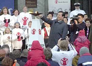 金大中總統10日出席了在奧斯陸市廳廣場舉行的"與2000名兒童在一起"活動, 並親手為活動點上"和平的火炬" .