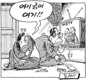 金大中總統(中)戴着耳機, 收看‘家臣電視臺’的節目. 他用表示‘國政刷新’的癢癢撓(抓撓的工具)撓着房間的地板. 這意味着金大中總統沒有正確地掌握民心所向.