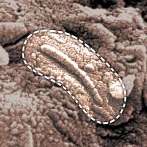 從火星的隕石ALH84001裡發現的細菌化石的電子顯微鏡照片中可以看到﹕ 管形的化石極為細, 僅為人髮的百分之一左右.
