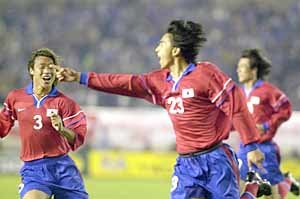20日在東京國立球場舉行的韓日友誼足球賽上半場14分? 安貞桓選手痛快地踢進了第一個球. 安貞桓選手首先獲得一分后, 馳騁球場, 高聲歡呼.