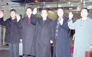 第一次南北經濟合作促進委員會28日將在平壤舉行.南韓代表團經金浦機場出國之前﹐ 向歡送的人們揮手致意.