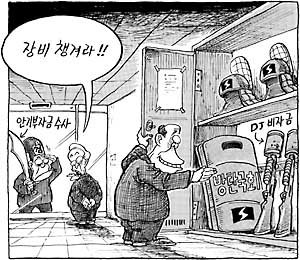一名檢察官(左)為調查安企部秘密資金,看著大國家党內部.從右邊能看到金大中總統的秘密資金(催淚彈),"防彈國會(盾牌)"等用于鎮壓示威的裝備.
