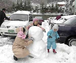 周日大田地區下了高達20厘米的大雪﹐在大田的某一棟公寓﹐孩子們正在堆着雪人.