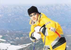 國內技術滑雪女子好手李銀我(音譯)站在龍坪滑雪場的彩虹路線,在出發前做呼吸調整.