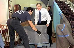 美國當選總統喬治‧W‧布什8日在德州州知事官邸與搬家公司的職員一起搬運前往白宮的東西.對搬東西顯出他不勝負荷的樣子.